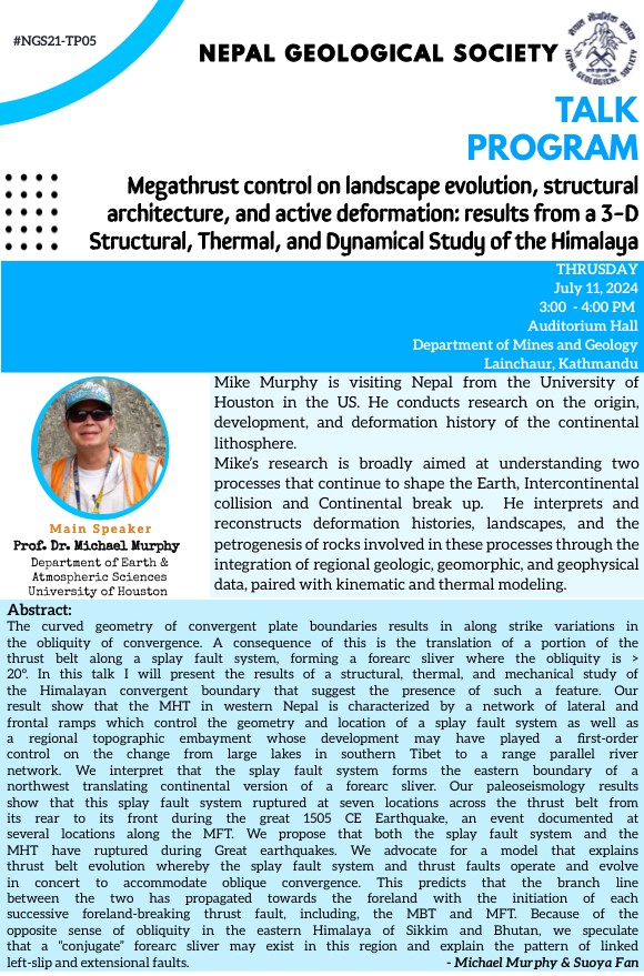 Recent Activities NGS Talk Program Series, #NGS21-TP05 Nepal Geological Society July 14, 2024 The fifth of the talk program series organized by 21st Executive Committee at the auditorium hall of Department of Mines and Geology, Lainchaur, Kathmandu. About the Author Nepal Geological Society Administrator Visit Website View All Posts Continue Reading Previous: NGS Talk Program Series, #NGS21-TP04Next: NGS Webinar Series, #NGS21-WB01 Related Stories Recent Activities Surrounding Topography Effects on Earthquake Ground Motions in the Kathmandu Basin Bhaskar Khatiwada January 13, 2026 Recent Activities NGS Talk Program Series, #NGS21-TP09 Nepal Geological Society September 1, 2025 Recent Activities NGS Talk Program Series, #NGS21-TP08 Nepal Geological Society August 11, 2025